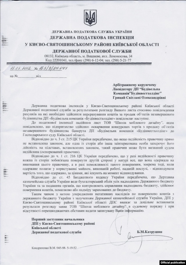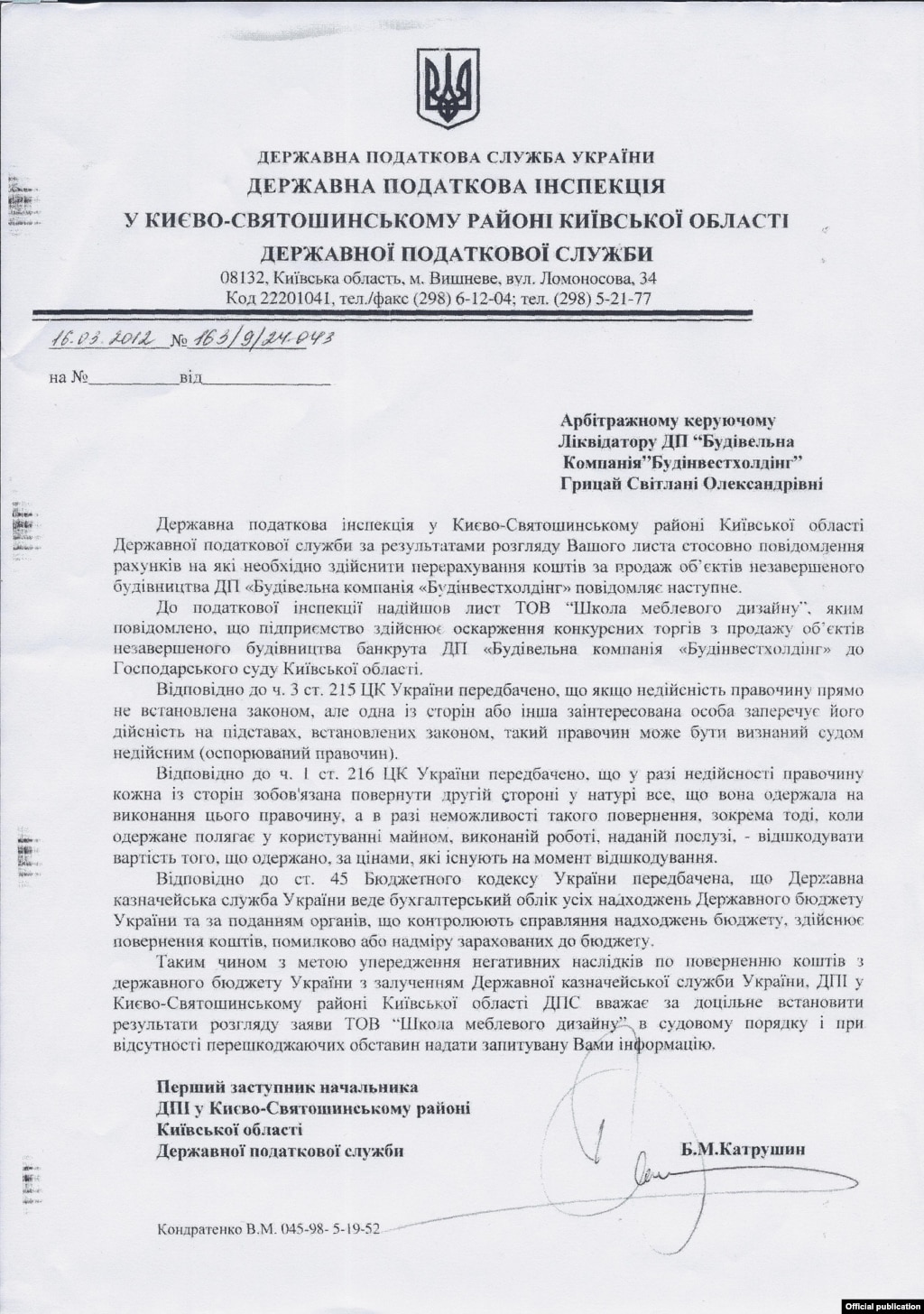 Налоговая инспекция Киево-Святошинского района не предоставила ответа Радио Свобода на время эфира, несмотря на официальный запрос. В частном разговоре представитель налоговой заметил, что она не имеет отношения к процессу, поскольку речь идет только о конфликте интересов кооператива и коммерческого предприятия, за право купить недострой. Когда корреспондент прибыл в офис ведомства, ему сказали, что руководители или болеют, или в отпуске.