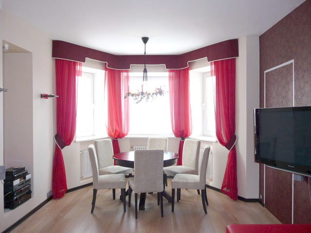 Гостиная может превратиться также в столовую, особенно если кухня не позволяет это сделать. Эркер может быть визуально отделен возвышением или возведением небольших перегородок по бокам. Отделочные материалы могут быть самыми разными, главное, чтобы все смотрелось гармонично. Легкие шторы, незаметный карниз, большой мягкий диван придадут уют и не будут закрывать красивый вид из окна. Не стоит препятствовать проникновения света.