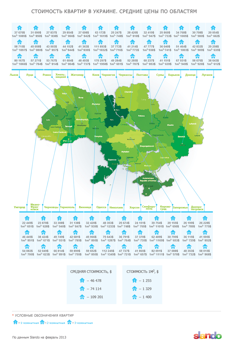 По данным Slando, по состоянию на февраль 2013 года, в Украине было порядка 440 тыс. объявлений о продаже квартир. Их средняя стоимость составила: