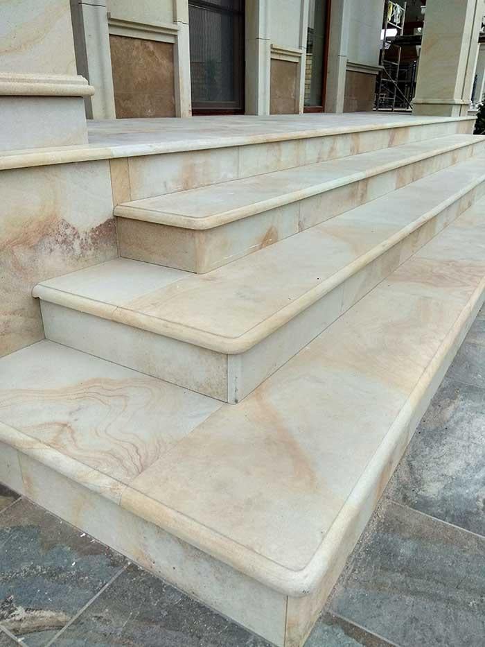 Компанія "Граніт Поліс" виробляє сходинки з натурального каменю пісковику різної форми — прямі, дугоподібні та неправильної форми. Ви можете замовити ступені різної товщини — від 30 до 60 міліметрів. Довжина одного виробу не перевищує 2000 мм. Однак, якщо вам потрібні довші — це не проблема. Ми можемо зробити будь-яку довжину з набору елементів. Варто зазначити, що заокруглювати краї щаблів не рекомендується. Це пов'язано з тим, що в дощовиту погоду камінь стає слизькішим, що є безпечним. Щоб мінімізувати ризик травмування — краще на кожному ступені зняти квадратну фаску від 2 до 5 мм. Прямі сходинки Такі ступені виконуються під необхідний розмір. Їх краї можуть бути як заокругленими, так і прямі — на вибір замовника. Підступ відбувається тієї ж довжини, що й сама сходинка. Її товщина становить 20 мм. Висоту замовник визначає сам, зважаючи на свої уподобання. Дугоподібні ступені Такі ступені виконуються за індивідуальними проєктами. Вони виготовляються за індивідуальними кресленнями або за шаблоном, наданим замовником. Важливо, що підступені для такого варіанту можуть бути реалізовані не з дрібних плиток, а з суцільного масиву, або з набору, що складається з 2-3 деталей. Сходи неправильної форми Під цим різновидом щаблів є з огляду на вироби, які не підпадають під два перші варіанти. Це можуть бути хвилясті щаблі, як-от трапеції та інше.