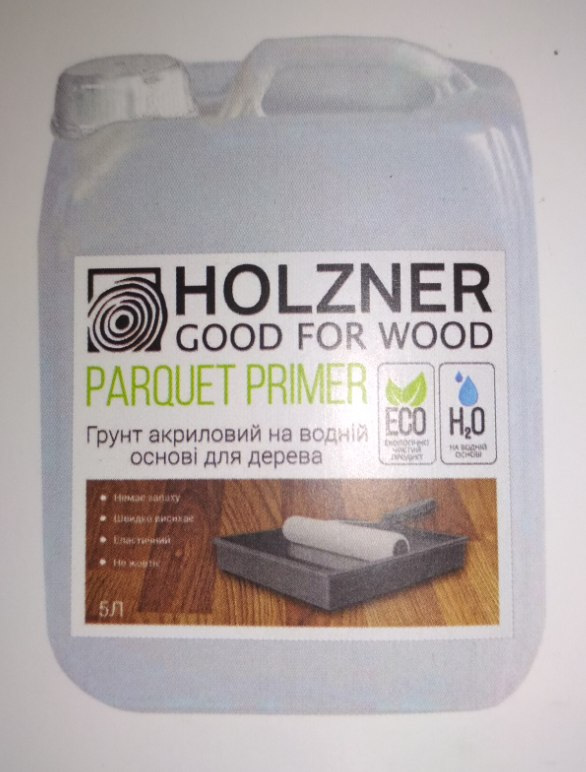 Holzner Parquet Primer - акриловый грунт для дерева на водной основе для нанесения валиком ао шпателем. Без запаха, созданный на базе акриловой дисперсии. Приначений для покрытия паркета и полов из древесины перед нанесением лака на водной основе. Легко наносится, снижает риск бокового склеивания планок паркета и уменьшает поднятия волокон древесины. Подходит для всех лаков на водной основе ТМ «Holzner».