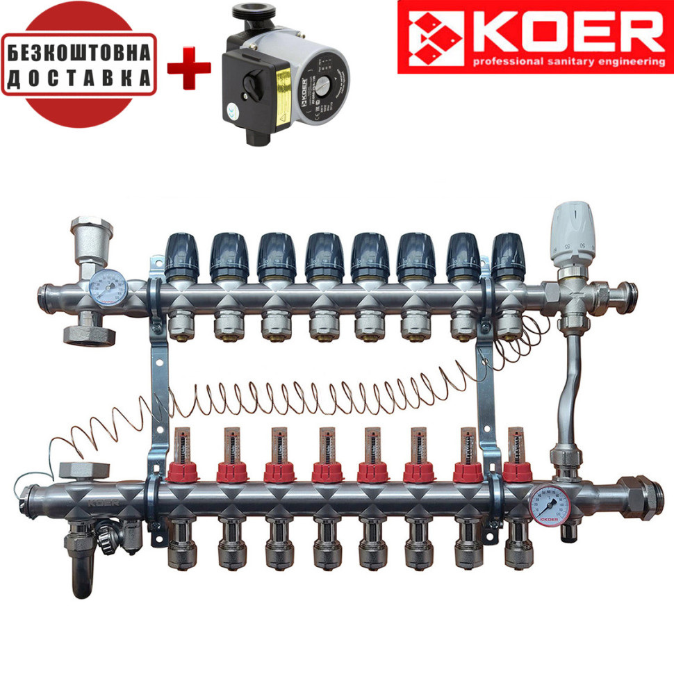 Основне завдання колектора для теплої підлоги KOER – змішування та перерозподіл потоків теплоносія. Залежно від кількості теплових контурів та площі приміщення, колектори можуть мати різну кількість необхідних для підключення висновків.