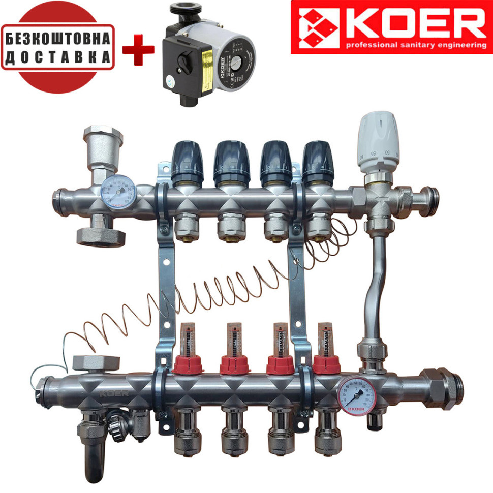 Основне завдання колектора для теплої підлоги KOER – змішування та перерозподіл потоків теплоносія. Залежно від кількості теплових контурів та площі приміщення, колектори можуть мати різну кількість необхідних для підключення висновків.