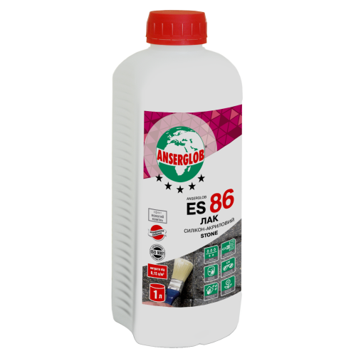 Лак силикон-акриловый Anserglob ES-86 STONE 1 л, предназначен для нанесения на поверхности, выполненные из мозаичной штукатурки ANSERGLOB, кирпича, гипсовых, цементных поверхностей, шифера, черепицы, декоративного природного и искусственного камня, декоративных штукатурок внутри и снаружи зданий (в том числе цоколей), с целью улучшения декоративных свойств поверхности, защиты основания от механических и биологических повреждений, а также загрязнений. Лак ANSERGLOB ES 86 силикон - акриловый после высыхания образует однородную эластичную, высокопрочную, прозрачную пленку, усиливает рисунок, придает гидрофобизирующие свойства поверхности, увеличивает срок службы, облегчает уход за покрытием. Лак стойкий к ультрафиолетовому излучению, влаге и моющим средствам, не содержит органических растворителей. Экологически безопасный.Лак силикон - акриловый ANSERGLOB ES 86 STONE перед применением следует тщательно перемешать. Лак наносится кистью, валиком или пневмораспылителем в один, а при необходимости в два слоя (в зависимости от характера поверхности). Работы на одной поверхности следует выполнять непрерывно, придерживаясь правила «мокрое на мокрое». Промежуточная сушка между слоями должна составлять 2 - 3 часа. Высохший лак устойчив к механическим воздействиям. После окончания работ, не допуская высыхания лака, инструмент необходимо вымыть водой.