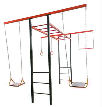 включает две качели на цепях, металлический рукоход, турник на цепи, кольца на цепи, две стойки-вертикальные опоры , две перекладины, комплект крепежа для сборки.