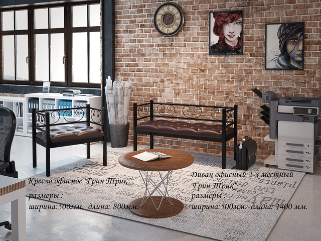 - офисная мягкая мебель, в металлическом корпусе и мягким сидением, также применим как решение для гостиной комнаты в доме в стиле Лофт.