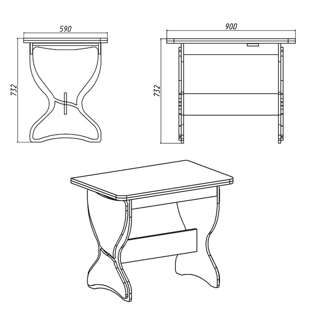 Ширина стола 590 мм, высота 732 мм, глубина-длина 900 мм, в развернутом виде глубина 1180 мм (раскладывание - система "книжка" , детальнее смотрите видео ниже).