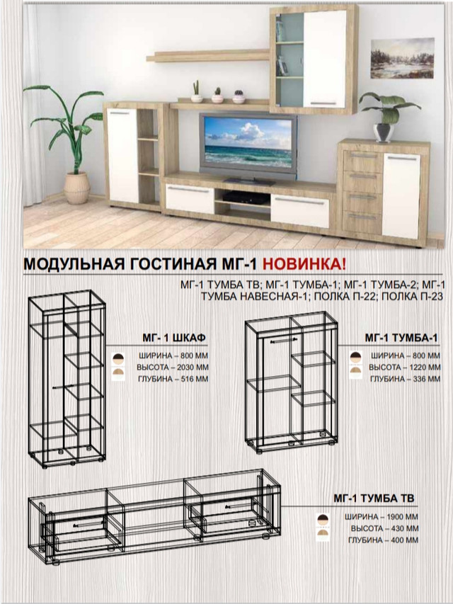 Стоимость указана за вариант - модульная мебель для гостиной Компанит МГ-1 цвет дсп дуб-сонома-комби наборная, которая имеет комплектацию такими секциями:
