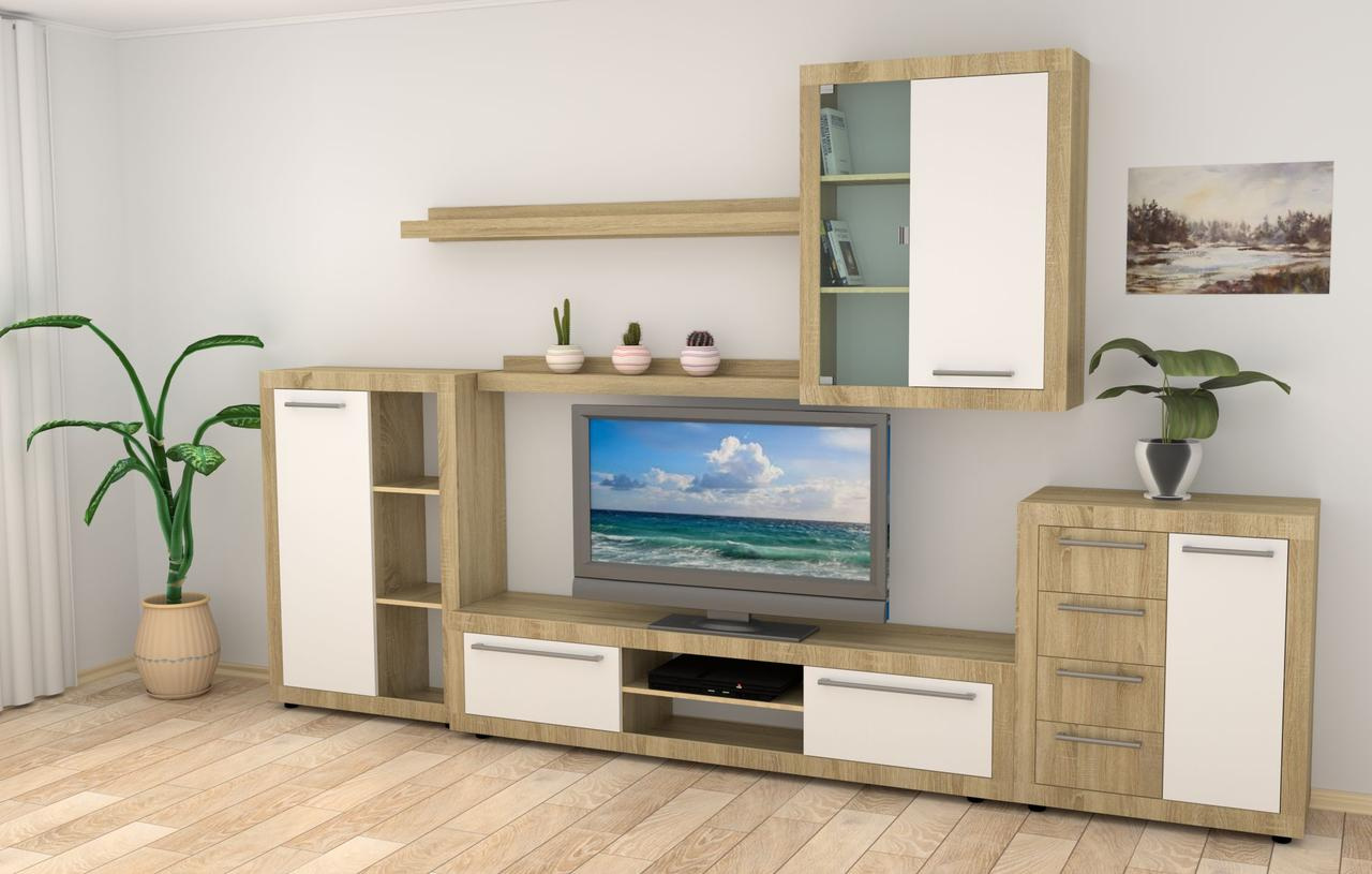 Комплект мебели в гостиную изготовлен из ламинированной плиты ДСП в цвете: дуб-сонома-комби.