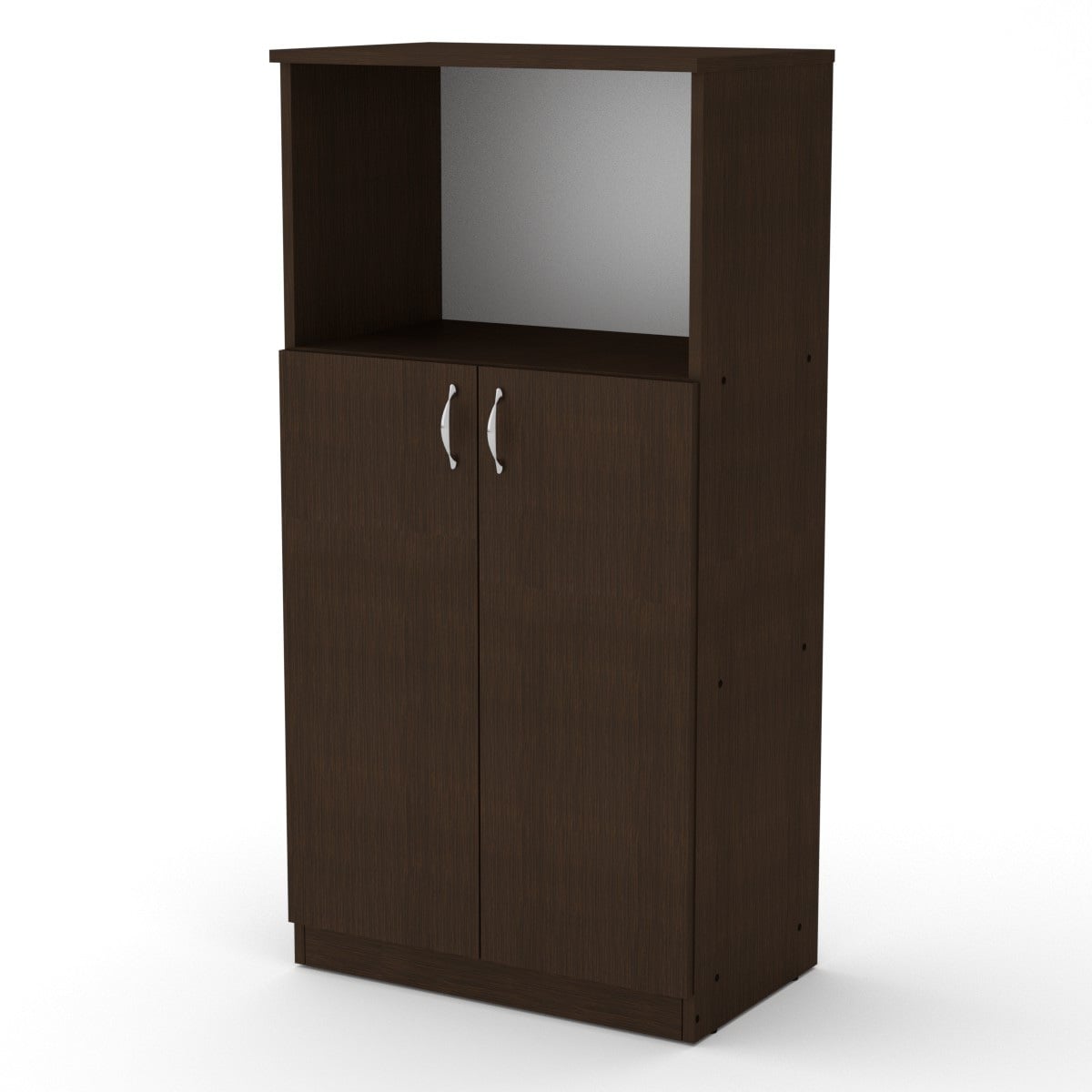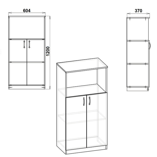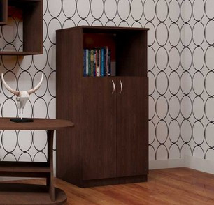 Невысокий двухдверный шкаф с распашными дверьками - компактный, имеет вместительную открытую нишу сверху и две полочки за закрытыми дверьками.