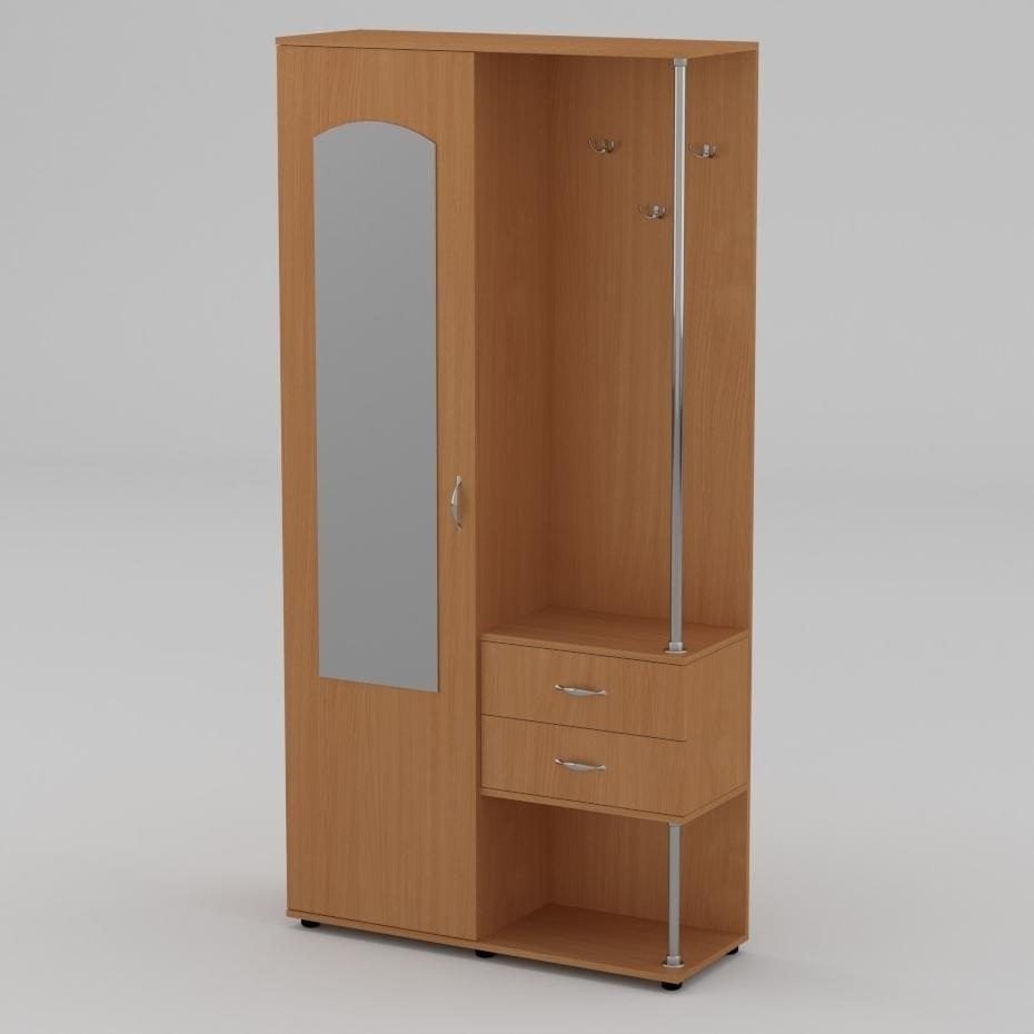 занимает немного места в коридоре, при этом такая компактная мебель для прихожей отличается функциональностью - есть зеркало на фасаде распашного шкафчика, три крючка для легкой одежды, два выдвижных ящика для мелких вещей, место для обуви.