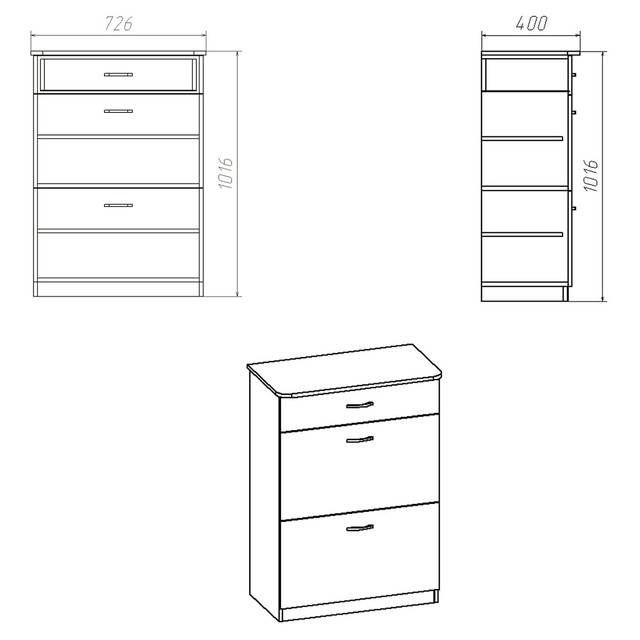 - Комод - тумбочка ТО-3А - ширина 726 мм, высота 1016 мм, глубина 400 мм; размер упаковки - 1005х405х165 мм; вес 31 кг.