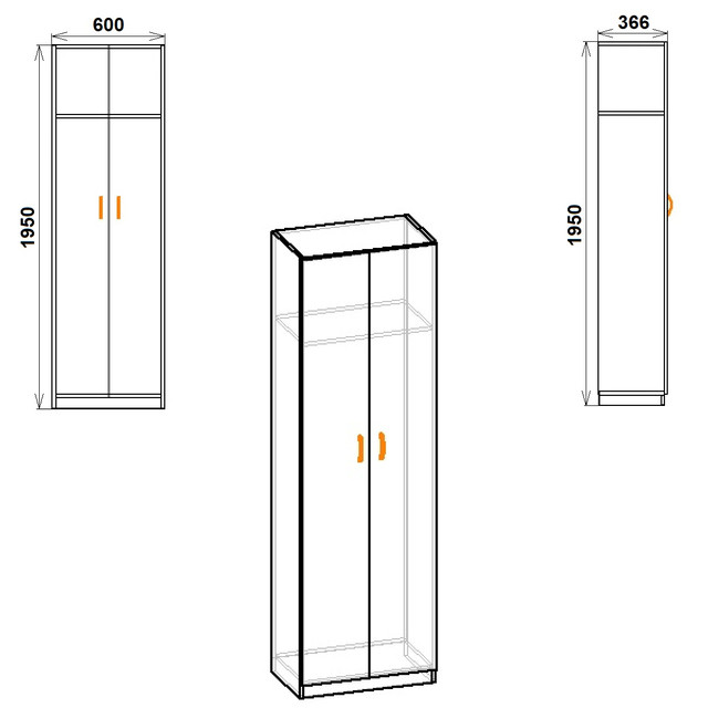 - Прямоугольный распашной Шкаф-11 - ширина 600 мм, высота 1950 мм, глубина 366 мм; размер упаковки - 1955x350x100 мм; вес 35 кг.