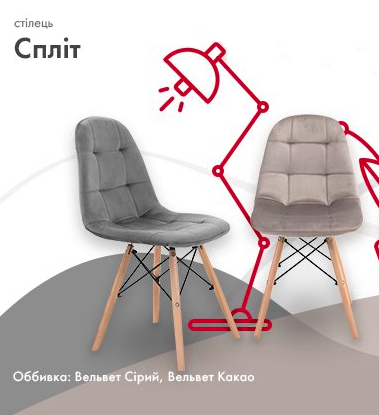 Мягкое и комфортное сидение выполнено в ткани велюр в темных оттенках: какао или сером, прочные ножки светлые - натуральное дерево с металлическим креплением между собой.