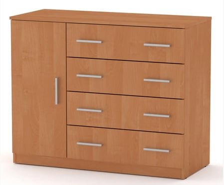 является функциональным предметом интерьера как для спальни, так и для любой комнаты в квартире, доме. Прямоугольный комод состоит из 4-х выдвижных ящиков справой стороны и одной ниши разделенной внутренней полочкой (с двумя внутренними полочками) за распашной дверькой - с левой стороні. Данный комод позволит вместить и хрнить большое количество вещей - от постели, до одежды.