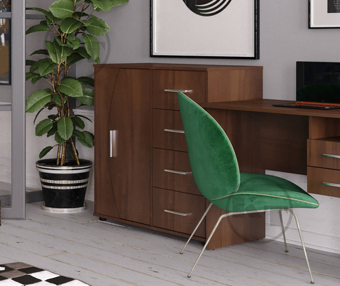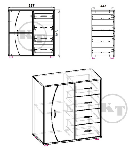 Комод прямоугольной формы, столешница ровная - удобна для размещения принтера или сувениров. Внутренее наполнение комода 4-1-1: справа 4 выдвижных ящика, слева одна распашная дверька - за которой две полочки.