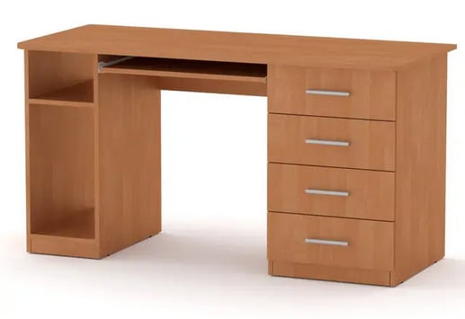 займет свое достойное место в современном офисе или квартире как письменный или компьютерный прямоугольный стол. Справа располагаются четыре выдвижных ящика, слева - стационарное место под системный блок компьютера или для вещей, имеется выдвижная полочка для клавиатуры.