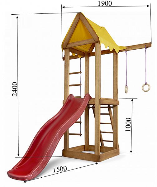 выглядит как домик с крышей, по лестнице ребенок может зайти на платформу для спуска с горки, рядом размещены гимнастические кольца и веревочная лестница.