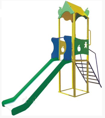 Сам спуск длиной 2 м из зеркальной нержавейки с бортами из влагостойкой фанеры, домик-площадка на опорах - также из фанеры, стойки - каркас и лестница из металла окрашенного. Предназначен для детей возрастом от 3 до 15 лет.