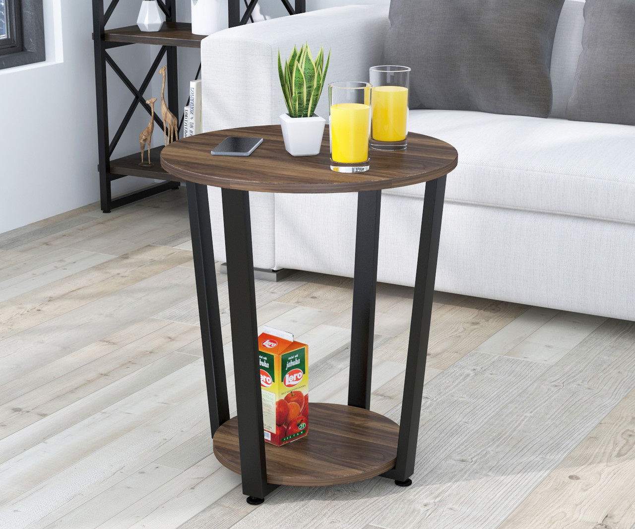 с круглой столешницей в современном стиле Лофт, его можно использовать и как стильный кофейный столик в зоне отдыха рядом с диваном в гостиной в комнате дома, так и для гостиниц совмещая с мягкой мебелью или как прикроватный столик и в офисах в приемной.