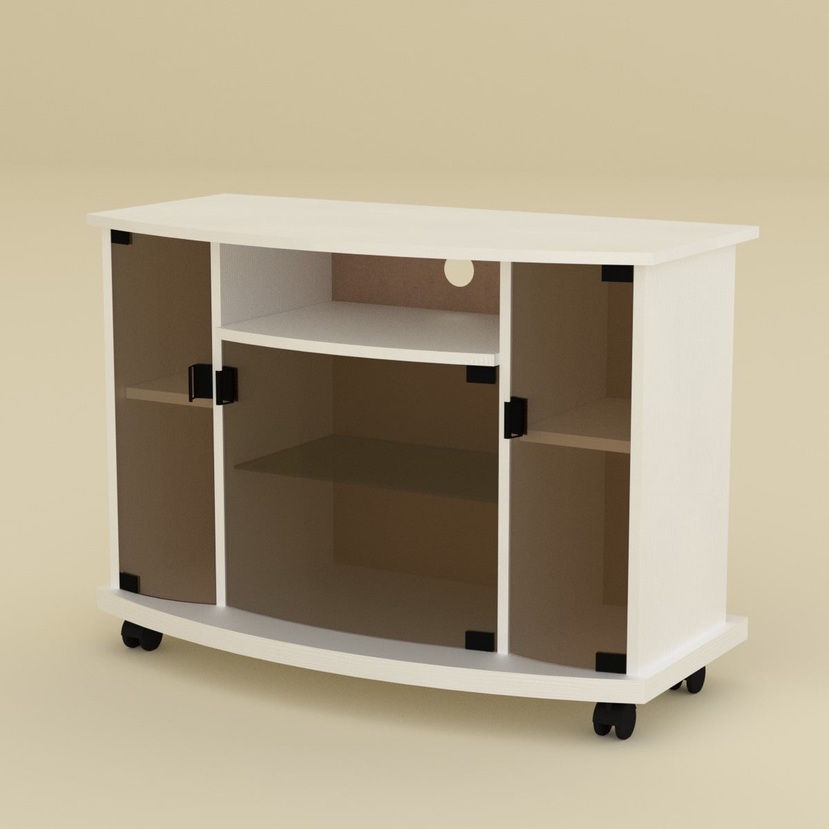Тумбочка стоит на роликовых колесиках, что позволяет легко передвинуть телевизор в любое место комнаты.
