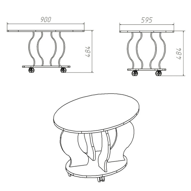 имеет овальную столешницу длиной 90 см из лдсп, ножки в виде фигурных опор упираются в дополнительную полочку-опору. Внизу пластмассовые колесики позволят легко перевозить столик в любой уголок.