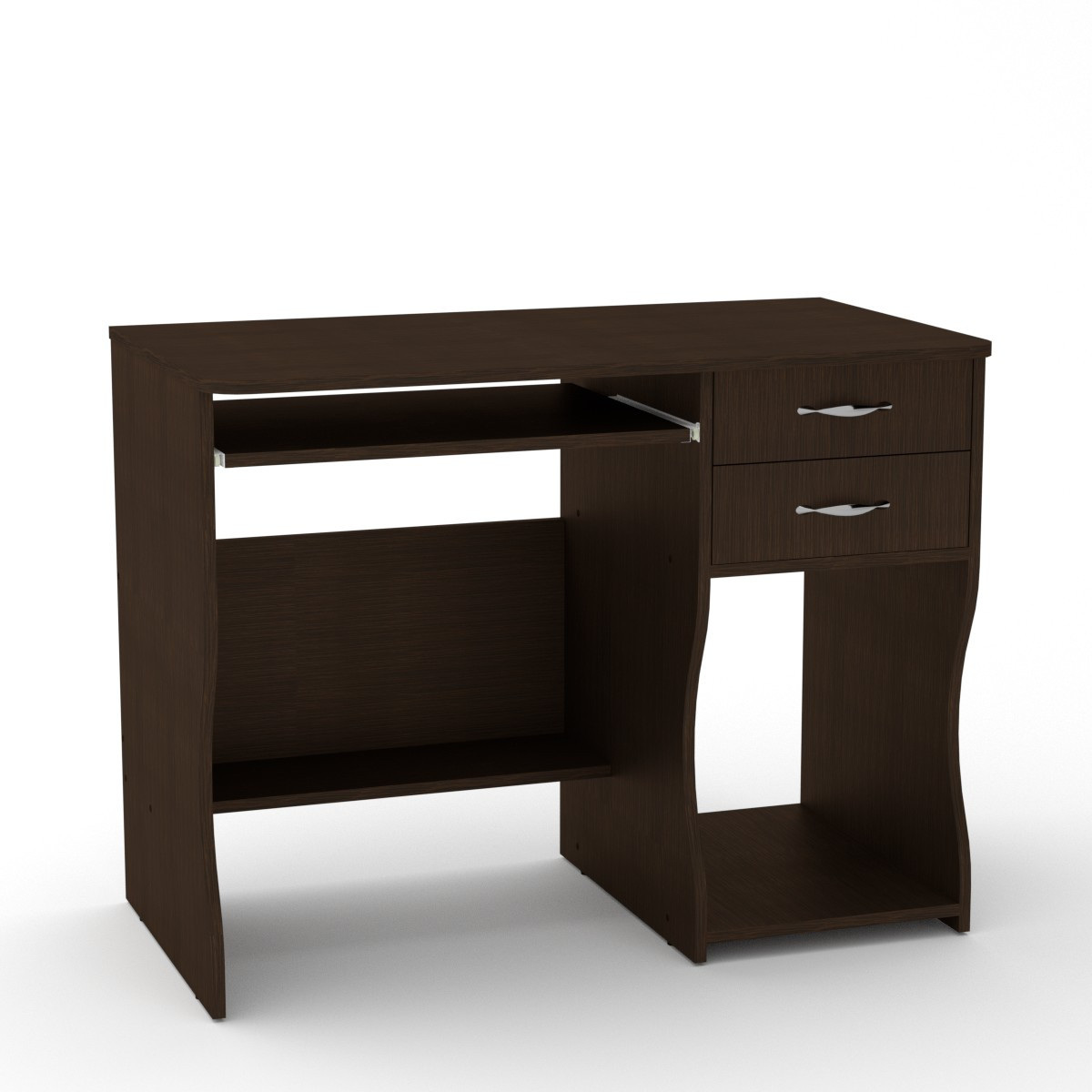 Стол создан с просторной рабочей поверхностью прямоугольной формы и с закругленными углами, ножки - сплошные устойчивые боковины волнообразной формы, оснащение - выдвижные ящики, открытые полки, полка под системный блок, выдвижная полка для клавиатуры.