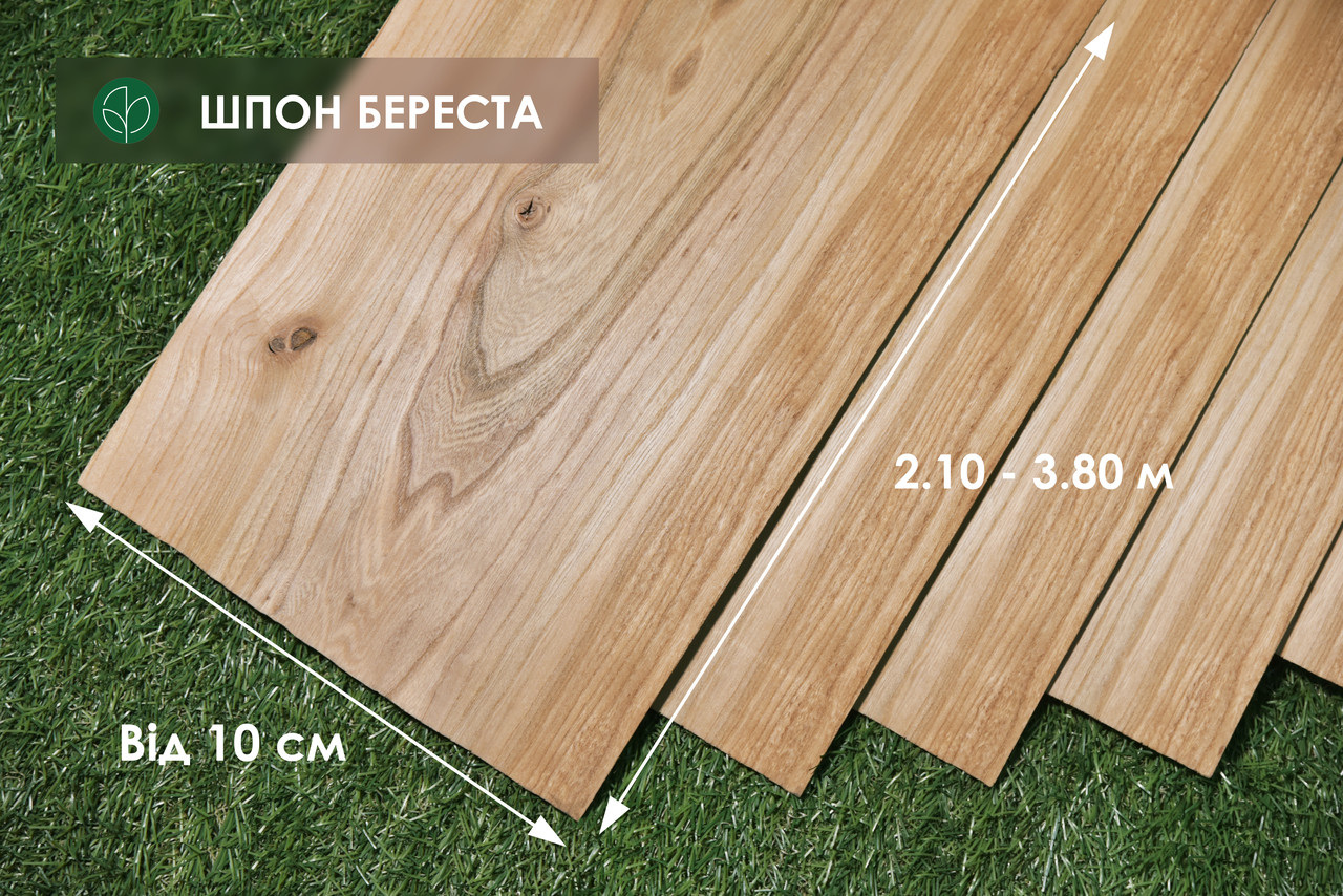 Характеристики товара Шпон Берест - 0,6 мм длина от 2,10 - 3,80 м / ширина от 10 см (I сорт)