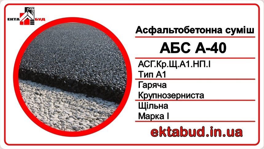 Асфальтобетон А-40 (АСГ.Кр.Щ.А1.НП.І) – крупнозернистый, плотный, типа А, непрерывной гранулометрии, марки І.