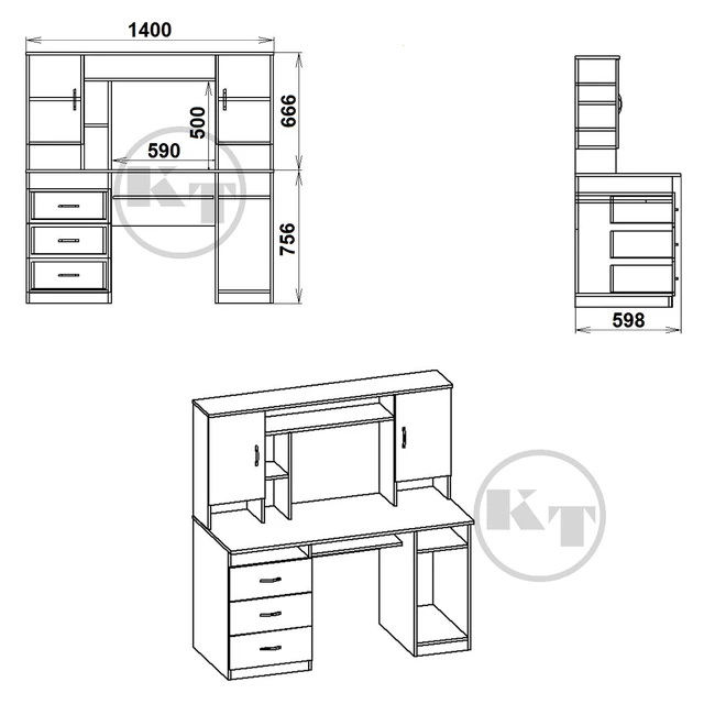 - Высота стола с конструкцией-шкафчиками - 1422 мм (756 + 666 мм).