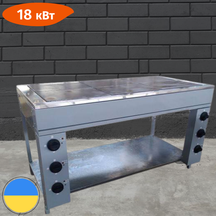 Кухонная электроплита весит 130 кг, имеет шесть плоских прямоугольных конфорок и устанавливается на пол.