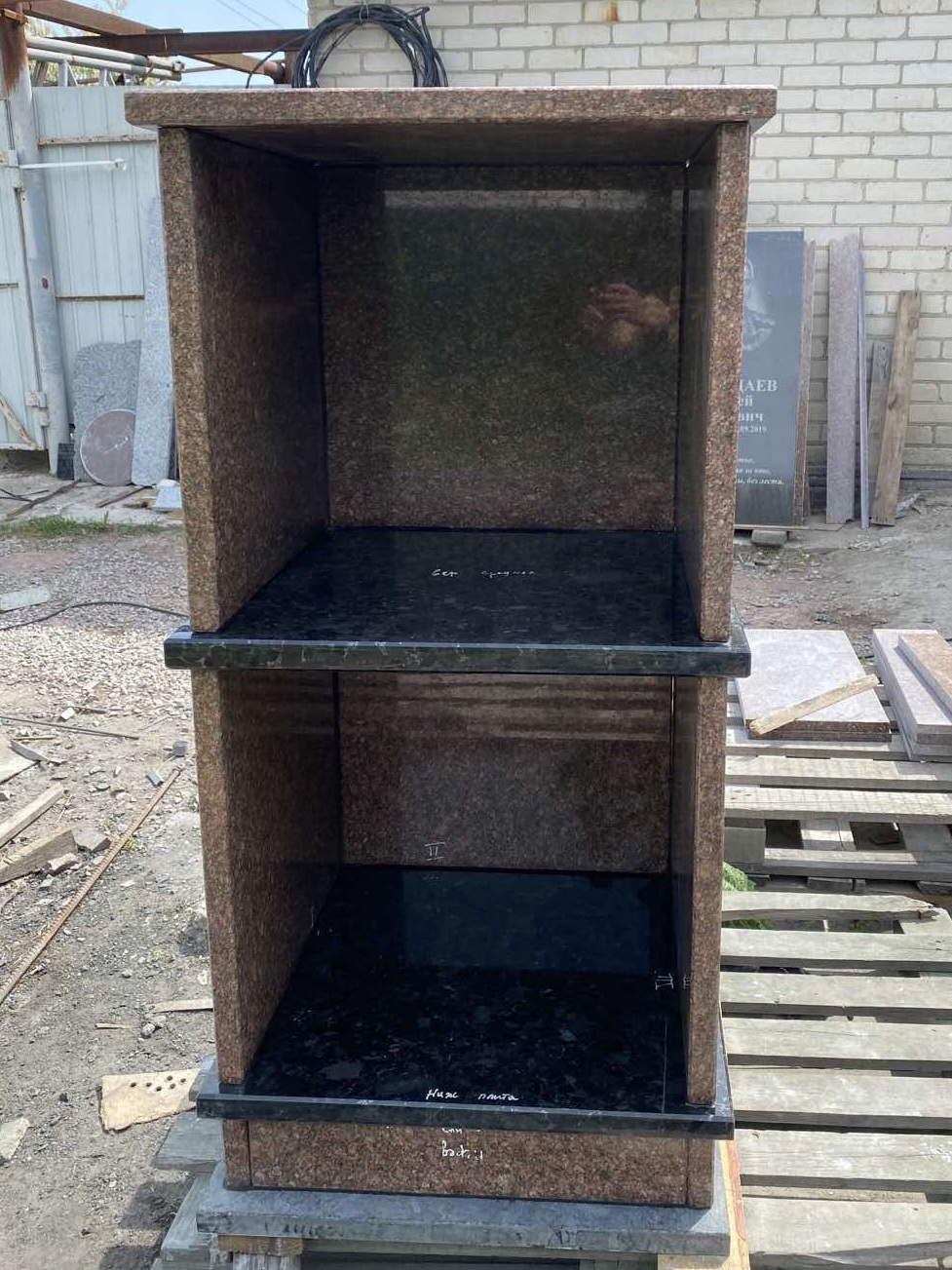 Колумбарий для праха комплект готовый к склейке и установке двойной : (в комплект входит : гранитные плиты готовые к сборке как конструктор Лего с пронумерованной инструкцией и деталировкой, армированные чопики, клей двух компанентный 1 туб по граниту, упаковка ), в основном изготавливаем двух уровневые изделия для двух урн. Камень можете заказывать любой под заказ который вам понравится, так же можем выполнять изделия по вашим размерам