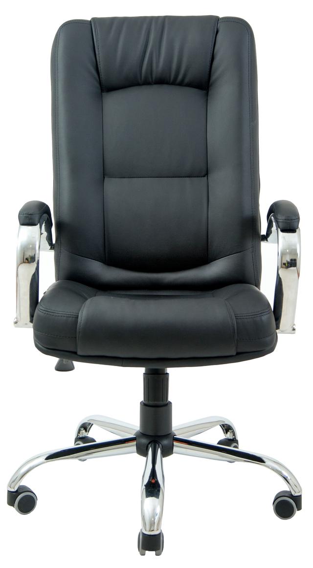Кресло имеет мягкое широкое сидение, высокую изящную спинку с декоративными подушечками по краям и надежную металлическую опору на колесиках, в цвете хром. Подлокотники также хромированные с мягкими накладками. Материал обивки - искусственная кожа черного цвета, материал - Скаден.