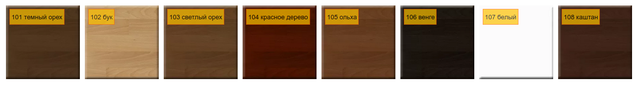 темный орех-101, натуральный бук - 102, светлый орех - 103, красное дерево - 104, ольха - 105, венге - 106, белый - 107, каштан - 108.