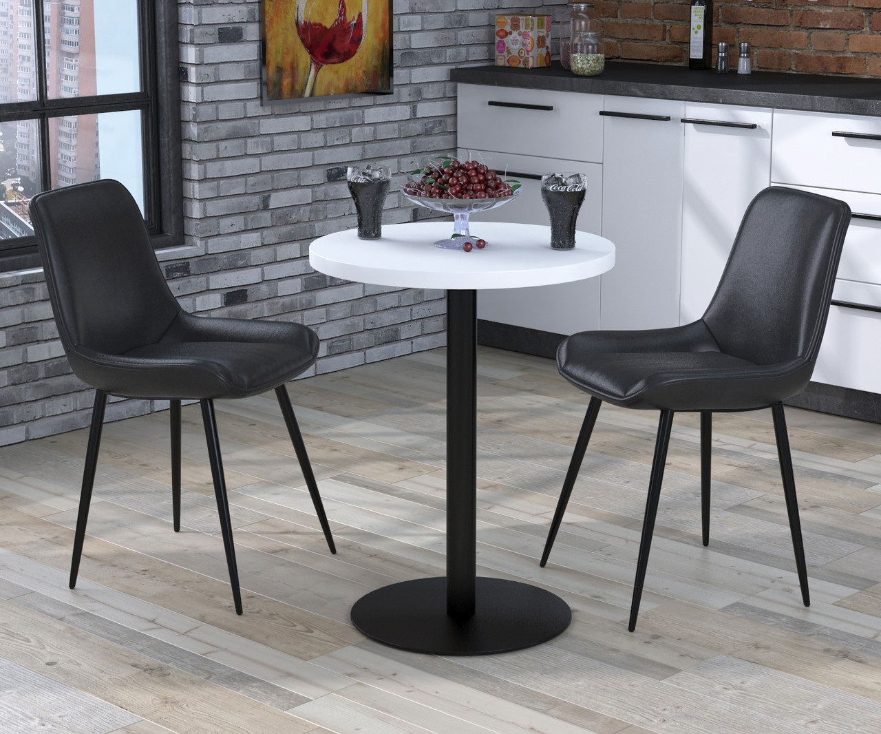 оригинальный кухонный стол в стиле лофт с круглой столешницей и на одной ножке с надежным основанием - за которым комфортно могут разместиться 2-3 человека.