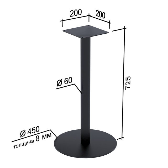 Опора стола состоит из основания, круглой ножки и крепления к столешнице. Основание изготавливается из листового металла 8 мм толщиной. Благодаря немалому весу и ширине 450 мм основание надёжно держит конструкцию квадратной столешницы с возможными кухонными предметами на нем.