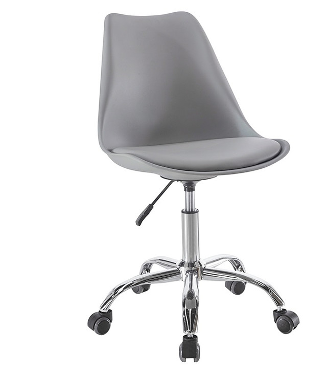 Кресло поворачивается и регулируется по высоте с помощью газлифта. Такое поворотное компьютерное кресло имеет хромированную крестовику на прорезиненных колесиках, сидение из пластика с мягкой подушкой.