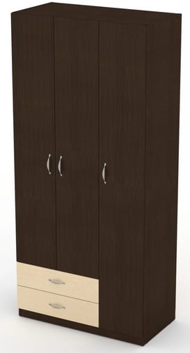 закрытого типа - платяной шкаф для одежды в спальне, в детскую комнату, в коридоре в доме или для офиса. Шкаф для одежды включает три распашные двери - слева две двери открывают отделение для вещей на вешалке, а внизу две выдвижные полочки; правая дверь - открывает 5 ниш для сменного белья.