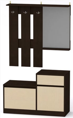 модульный набор, включает - три крючка для верхней одежды вешалку открытую, полочку для головных уборов, выдвижной ящик с тумбочкой для обуви с двумя отделениями за распашными дверьками, прямоугольное настенное зеркало. Прихожая мебель имеет компактные размеры и применима в коридоре небольшой квартиры или для дома.