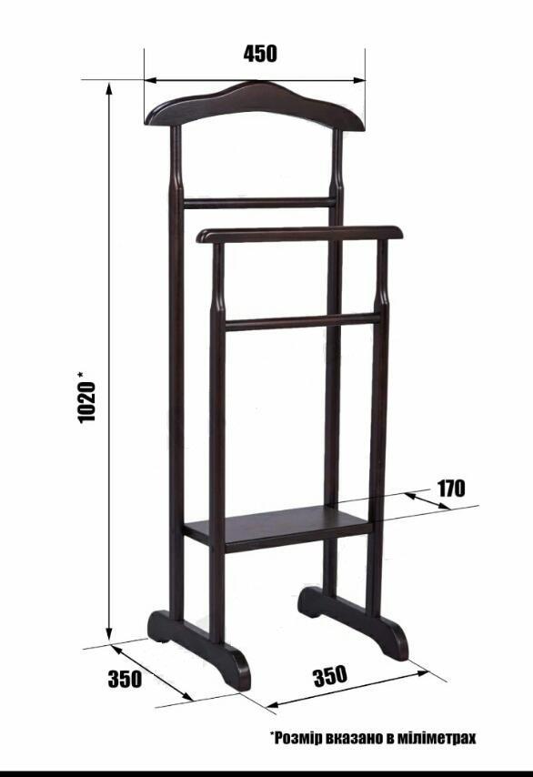 имеет внизу-внутри конструкции подставку под обувь, а основа вешалки - плечики для одежды и перекладина для брюк или юбок.