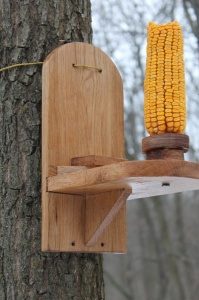 Деревянная кормушка для подкармливание белок. Возможно Вы будете удивлены, но белки очень любят кукурузу, а в городских условиях белкам ее достаточно сложно найти. В этом, Вы можете прийти к ним на помощь. Повесив кормушку на дерево в парке или сквер. Очень часто мы наблюдаем за игрой белочки сидя в парку на лавочке.
