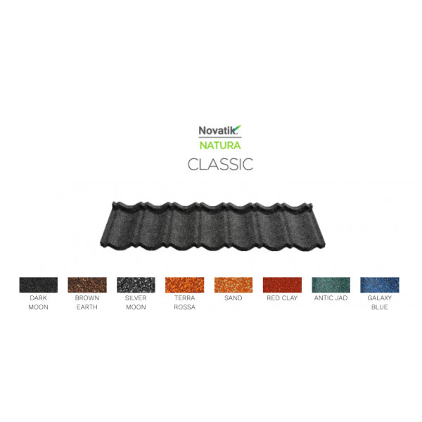 Композитні аркуші черепиці Novatik NATURA CLASSIC Вони зберігають свою універсальність і елегантність завдяки симетричному дизайну і гармонійно кручені лінії металопрофілю. Довговічність і візуальний зовнішній вигляд Novatik NATURA CLASIC є ідеальним розв' язанням для притулку в традиційному класичний європейський стиль.Технічні характеристики Novatik NATURA CLASSIC: