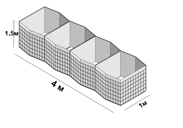 Длина одной секции стандартно 4 метров (может быть изготовлена любое кол-во метров под заказ), из секций собираются блоки, которые могут быть разной конфигурации и высоты. Из которых можно быстро построить блок пост или просто вести огонь поверх такого блока с песком высотой 1 метр. В качестве сетки для габионов используется оцинкованная сварная сетка с диаметром проволоки от 3,8 до 5,0 мм и ячейкой 50*50 мм или 100*100мм.