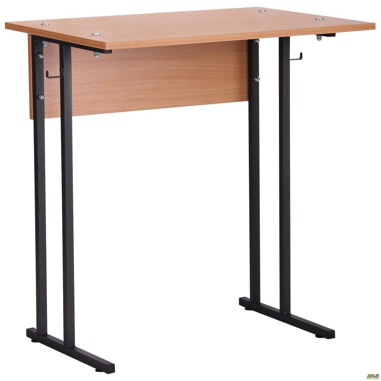 Предусмотрены крючки для сумок, кромка стола изготовлена из пластика толщиной 2 мм. Каркас из окрашенной (порошковой краской) квадратной трубы 20x20 мм, прочный и надежный. Столешница из ламинированного ДСП (царга и полка стола выполнены из ламинированного ДСП, толщиной 16 мм цвета бук), высота фиксированная и не регулируется.