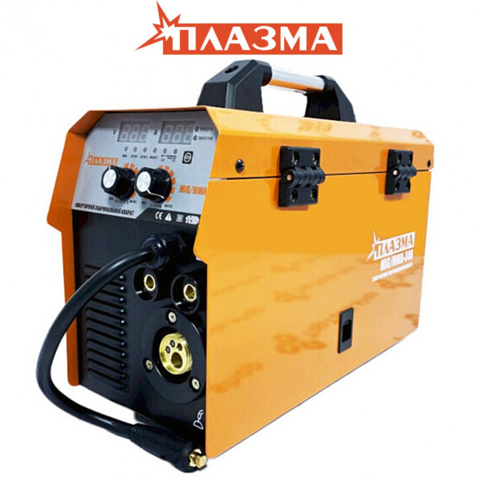 Инверторный сварочный полуавтомат Плазма MIG/MMA-340 универсальный сварочный аппарат для бытового или домашнего использования. Представляет собой две сварки в одном корпусе. Это дает возможность производить работы как и электродами, так и проволокой. На передней панели присутствуют два цифровых дисплея на которых отображаются такие параметры, как величина сварочного тока и напряжение. Три регулятора позволяют плавно настраивать величину сварочного тока, напряжение и скорость подачи проволоки. В режиме полуавтомата работает с многими видами и типами сварочной проволоки (омедненная, флюсовая, нержавейка) толщиной 0.6-1.0мм, в режиме дуговой сварки ММА — электродами для постоянного тока диаметром 1,6-5,0 мм. Небольшое потребления электроэнергии позволяет подключать полуавтомат к обычной сети 220В, при этом нагрузка на сеть будет минимальной. Сварочный полуавтомат Плазма MIG/MMA-340 имеет ряд преимуществ перед аналогичными сварочными аппаратами: низкая цена, удобное и понятное управление настройками сварки, возможность проводить сварку без газа, защита от перепадов напряжения, встроенные функции "ANTI STICK" и "HOT START". Охлаждения внутри корпуса — воздушно принудительного типа и проводится с помощью мощного вентилятора, установленного на задней части устройства.