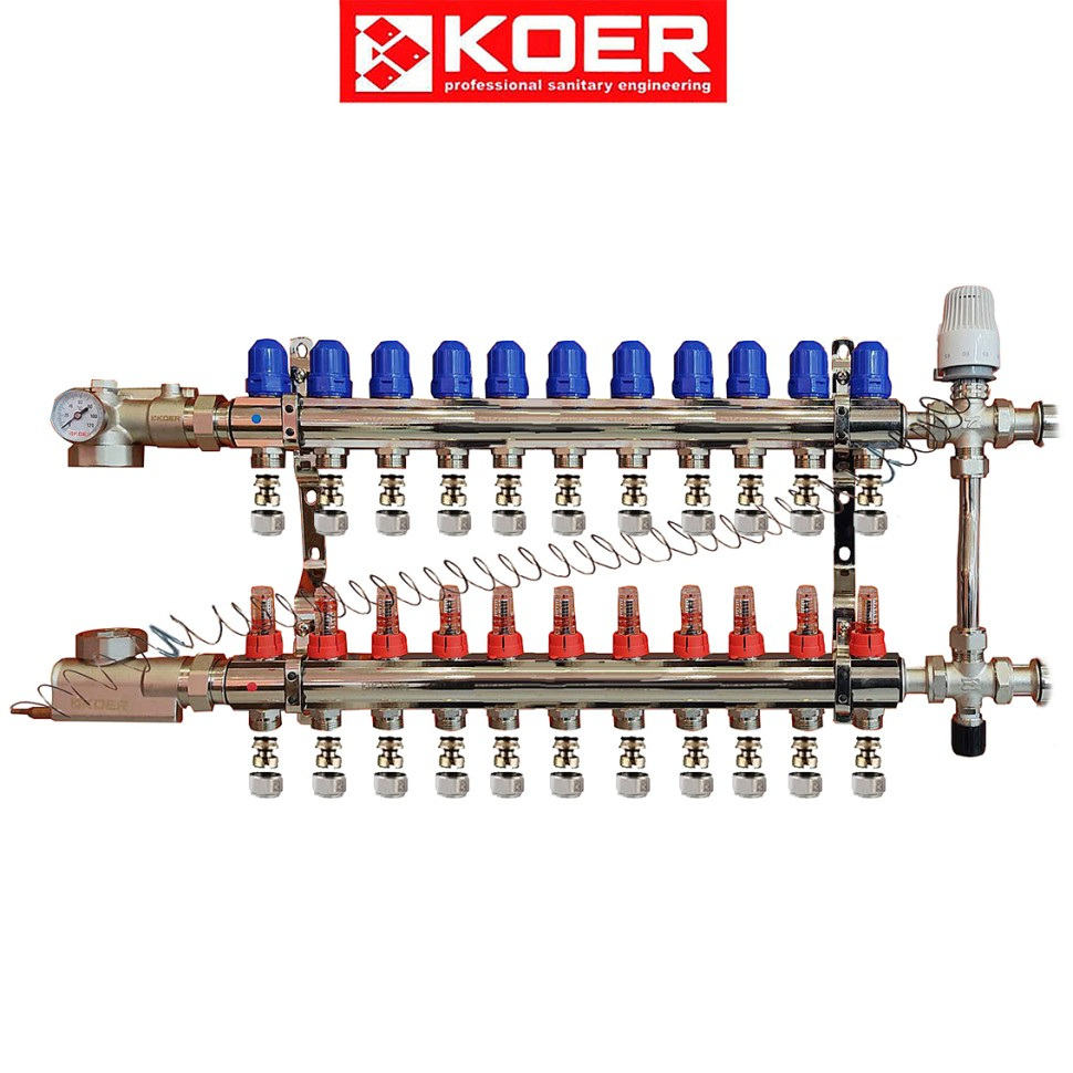 Основне завдання колектора для теплої підлоги KOER – змішування та перерозподіл потоків теплоносія. Залежно від кількості теплових контурів та площі приміщення, колектори можуть мати різну кількість необхідних для підключення висновків.