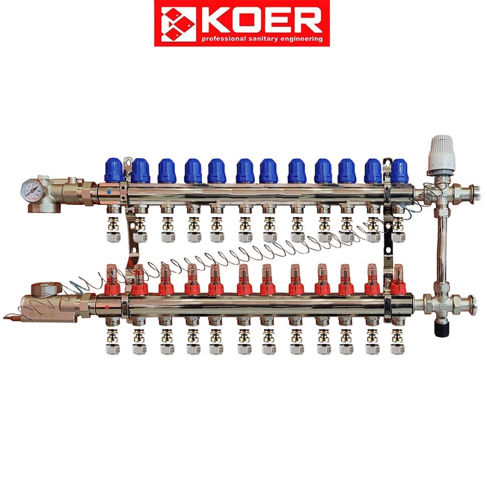 Основне завдання колектора для теплої підлоги KOER – змішування та перерозподіл потоків теплоносія. Залежно від кількості теплових контурів та площі приміщення, колектори можуть мати різну кількість необхідних для підключення висновків.