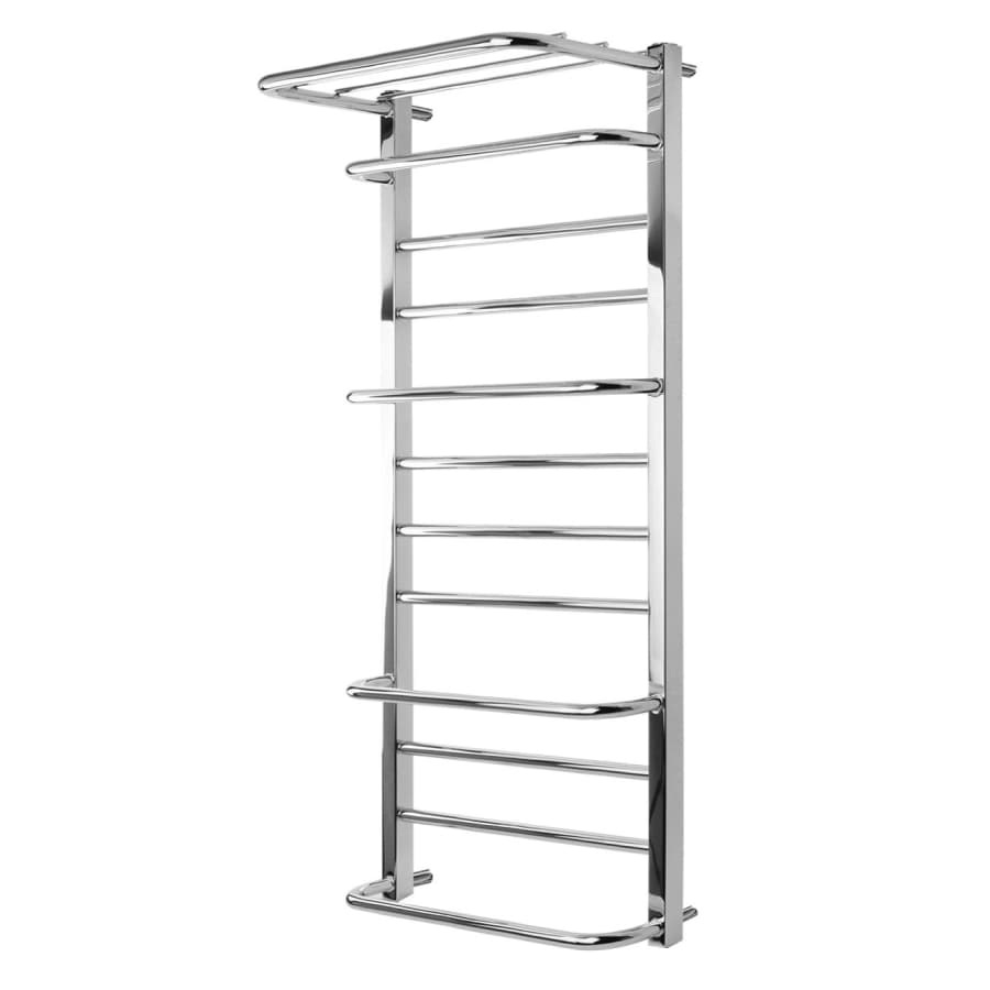 Функциональный водяной полотенцесушитель Mario Люксор 1200х630/600 высушит ваше белье и создаст комфортную температуру в ванной. Изделие из нержавейки марки AISI 304 в форме лесенки имеет 11 прямых и П-образных секций, и вместительную полку в верхней части конструкции. Сталь быстро нагревается и хорошо отдает тепло; тепловая мощность прибора: 410 Вт. Подключается данная модель к системе отопления или ГВС, что дополнительно экономит расходный ресурс. Подвод воды – нижний; межосевое расстояние – 60 см; внутренняя резьба – 1/2 дюйма.
