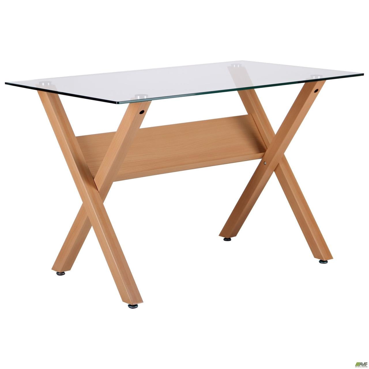 Столешница выполнена из прочного закаленного стекла толщиной 10 мм - прозрачное, а фигурные металлические ножки окрашенные в цвет дерева бук (светлый).