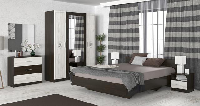 Цвет спального комплекта мебели - выполеннной из лдсп 16 мм - оттенок "венге"+"дуб крафт белый". Это недорогая готовая мебель эконом вариант в спальню в современном стиле.